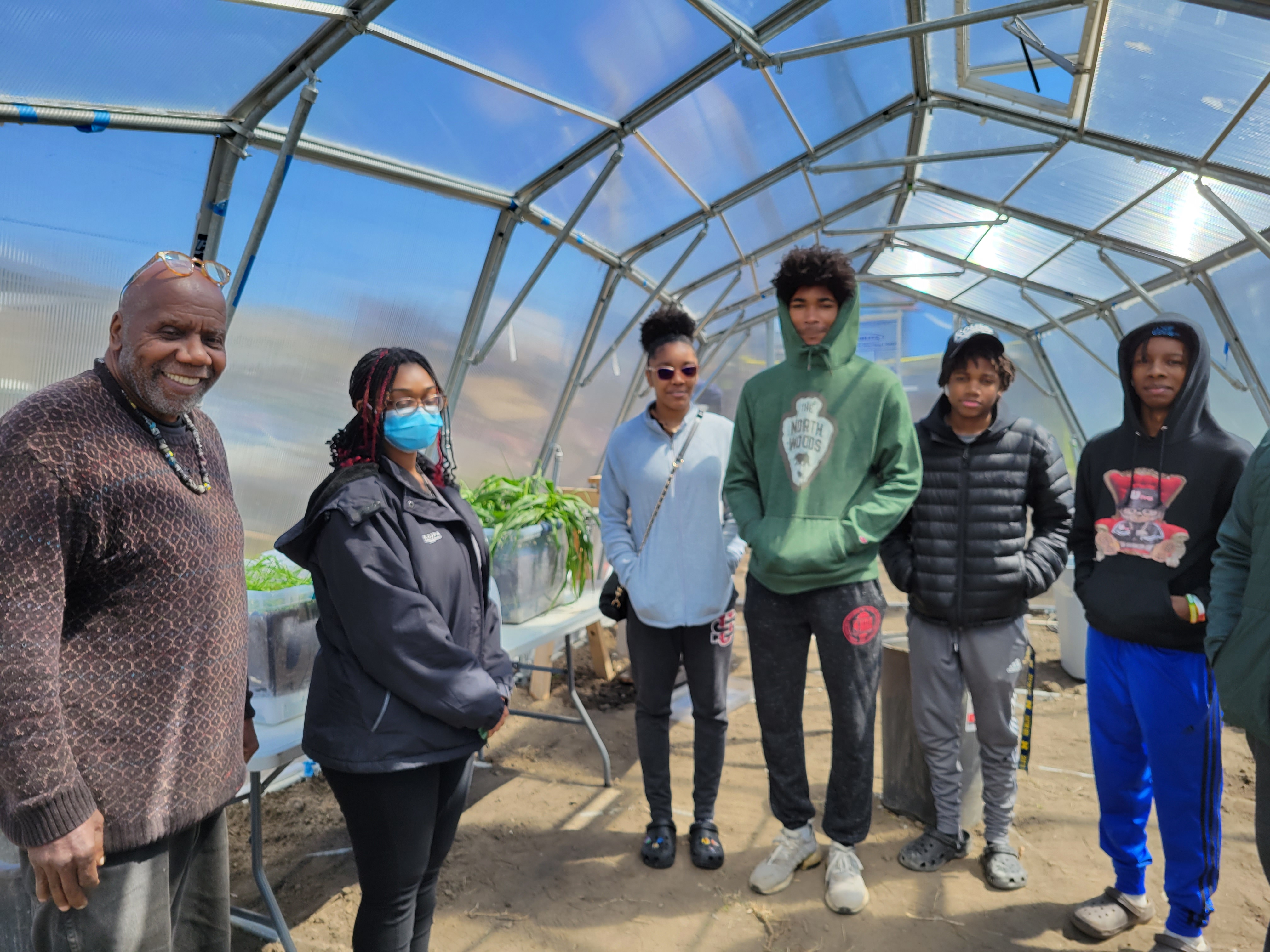 The high school interns took the next step. Here you see them in the greenhouse with Olayami Dabls, the founder and curator of the MBAD African Bead Museum:
