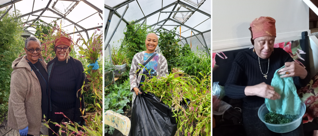 Below you can see our fiber artist partners Judy Sledge, Geneva Phillips and Mandisa Smith, harvesting indigo and experimenting with different dye techniques using fresh leaves.