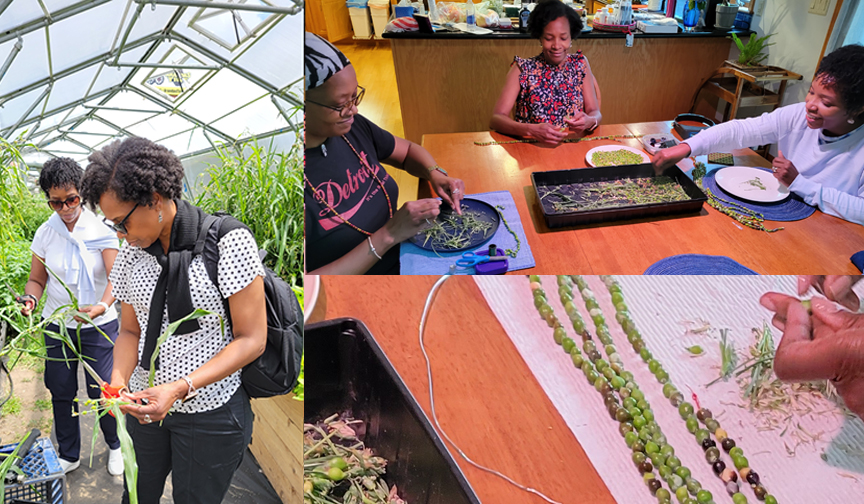 And we celebrated our first harvest of the seed beads with professor Bennett and her two sisters doing the stringing.