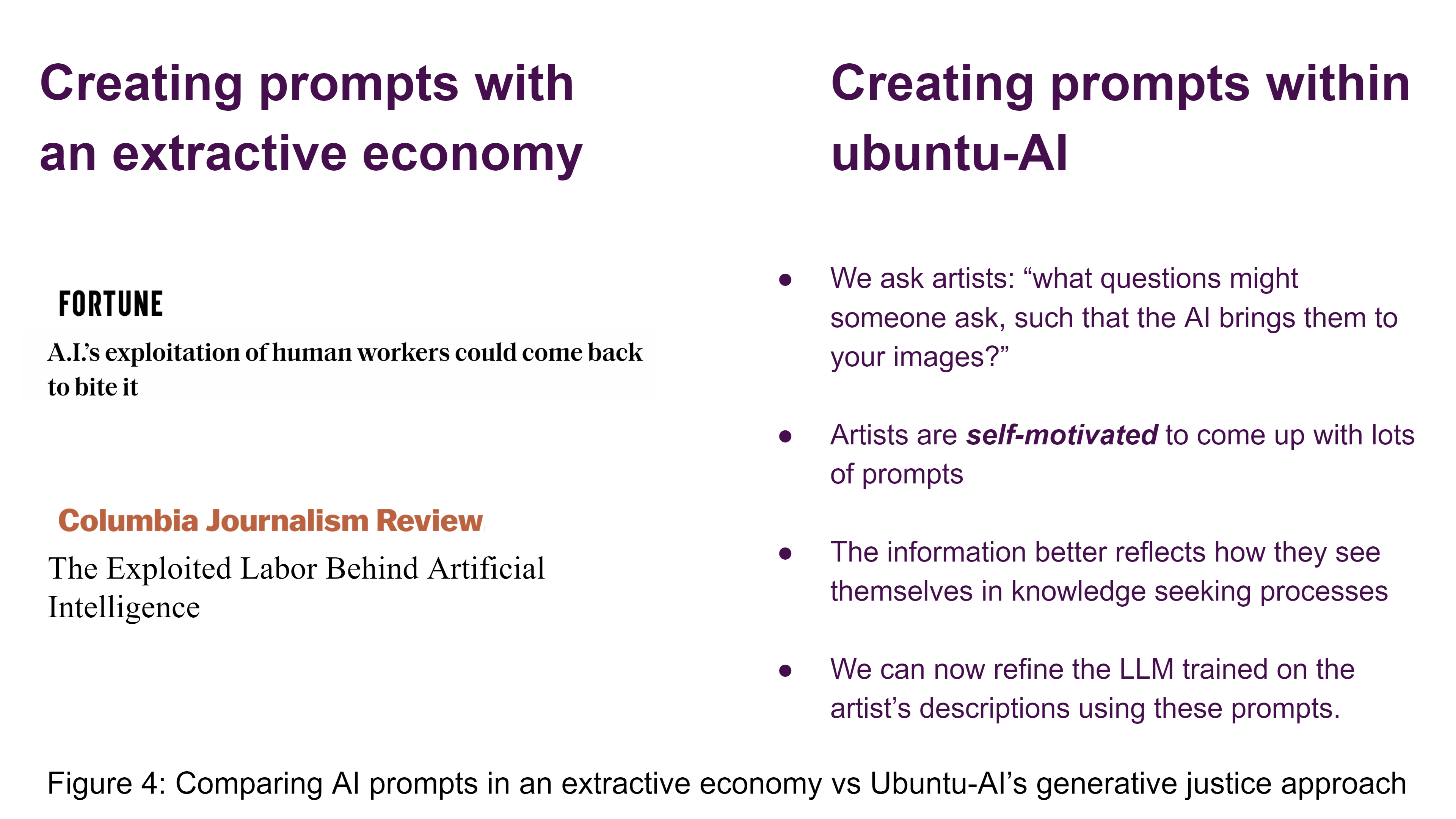 As noted above, when we asked AI for examples of questions about African art, the examples it gave showed Africa as merely “inspiration” for Europeans. For that reason we ask the contributors to create questions (“prompts”) that someone might ask AI, in which the answer could lead them to your work. That might be “which plants make the dyes in Ghana’s adinkra” or “How do Nigerians use digital technology in art” or anything involving their expression and work as an African creative. These can then be used to test the LLM based on the collected data, as the “human feedback” part of generative AI. In other words, we hope to bring AI and the public more accurate and diverse information about creative works in Africa, based on the perspectives of African creatives. While human reinforcement in LLM training is notorious for its exploitative labor, this offers a far more equitable model, since it aligns the contributors' own interests with prompt creation tasks (figure 4).